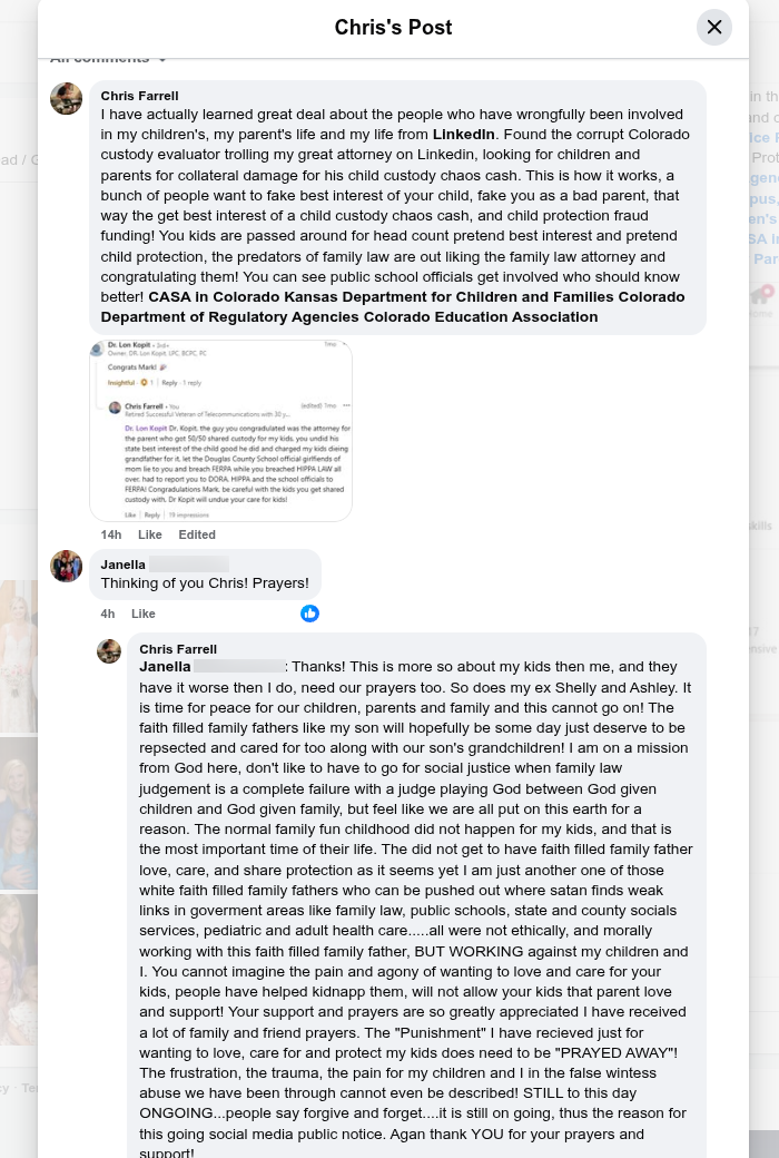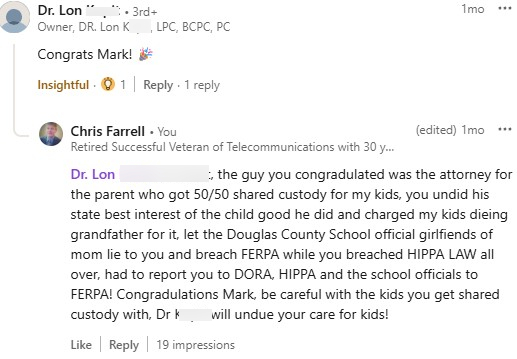 I have actually learned great deal about the people who have wrongfully been involved in my children's, my parent's life and my life from LinkedIn. Found the corrupt Colorado custody evaluator trolling my great attorney on Linkedin, looking for children and parents for collateral damage for his child custody chaos cash. This is how it works, a bunch of people want to fake best interest of your child, fake you as a bad parent, that way the get best interest of a child custody chaos cash, and child protection fraud funding! You kids are passed around for head count pretend best interest and pretend child protection, the predators of family law are out liking the family law attorney and congratulating them! You can see public school officials get involved who should know better! CASA in Colorado Kansas Department for Children and Families Colorado Department of Regulatory Agencies Colorado Education Association
