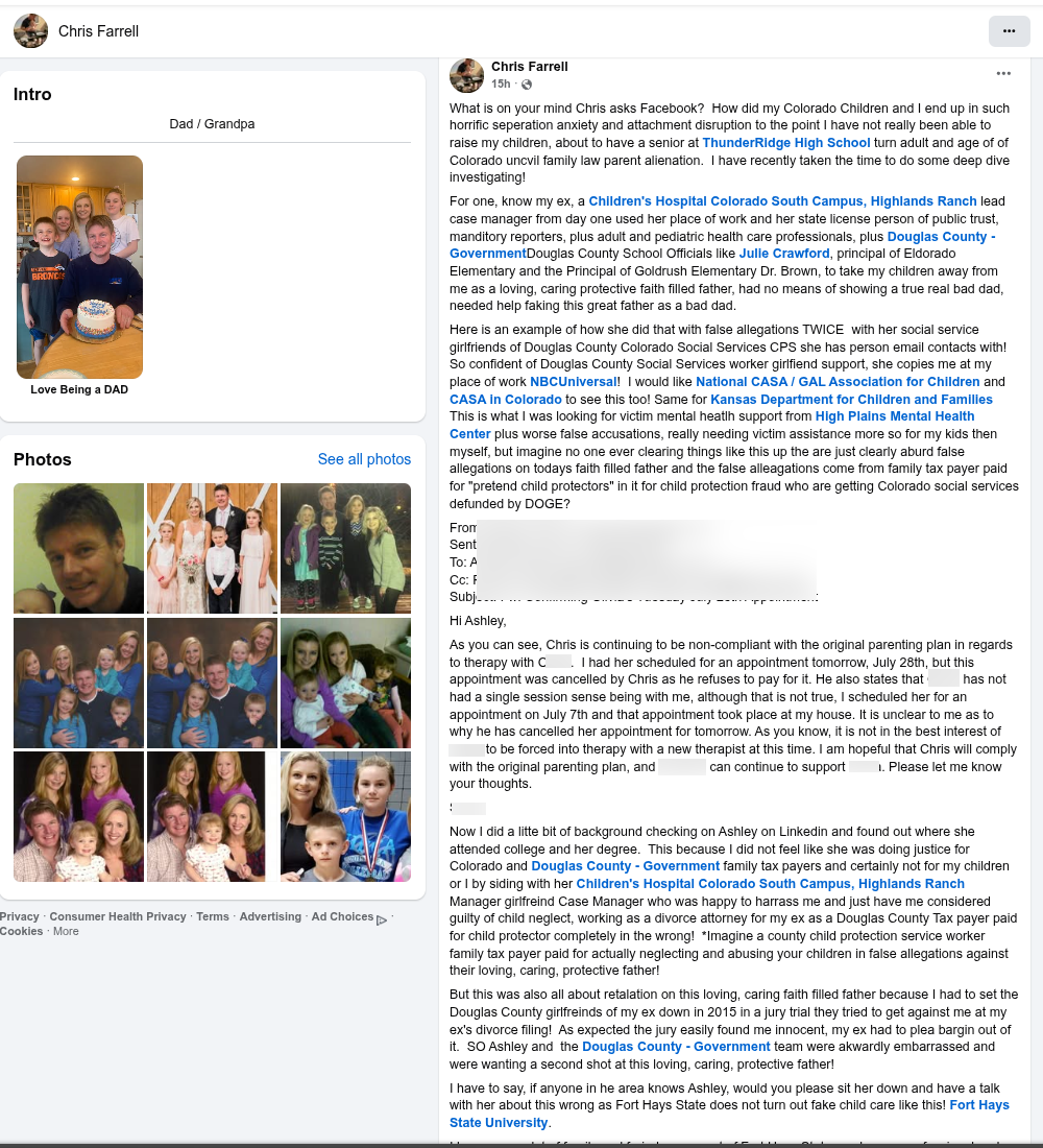 Ashley just apparently did not know the Engel and Farrell family in the area and those faith filled families and she certainly did not know me, our kids or my love and care and share of them!- Douglas County - Government Douglas County Sheriff's Office Parker Police Department Douglas County Parents Freedom Network @Colorado Child Protection Ombudsman Office Colorado State Patrol Colorado Department of Regulatory Agencies Colorado Parent Advocacy Network Children's Hospital Colorado North Campus, Broomfield The Colorado Attorney General's Office Family Access-Fighting for Children's Rights Colorado Parent Magazine Kansas Department for Children and Families CASA in Colorado Moms for Liberty - Douglas County, CO Stand for Children - Colorado Erin for Parental Rights 9NEWS (KUSA)