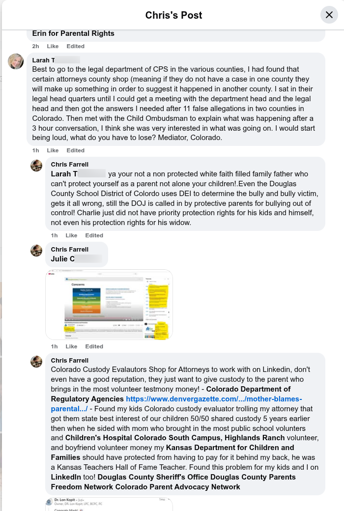 Colorado Custody Evalautors Shop for Attorneys to work with on Linkedin, don't even have a good reputation, they just want to give custody to the parent who brings in the most volunteer testmony money! - Colorado Department of Regulatory Agencies https://www.denvergazette.com/.../mother-blames-parental.../ - Found my kids Colorado custody evaluator trolling my attorney that got them state best interest of our children 50/50 shared custody 5 years earlier then when he sided with mom who brought in the most public school volunters and Children's Hospital Colorado South Campus, Highlands Ranch volunteer, and boyfriend volunteer money my Kansas Department for Children and Families should have protected from having to pay for it behind my back, he was a Kansas Teachers Hall of Fame Teacher. Found this problem for my kids and I on LinkedIn too! Douglas County Sheriff's Office Douglas County Parents Freedom Network Colorado Parent Advocacy Network