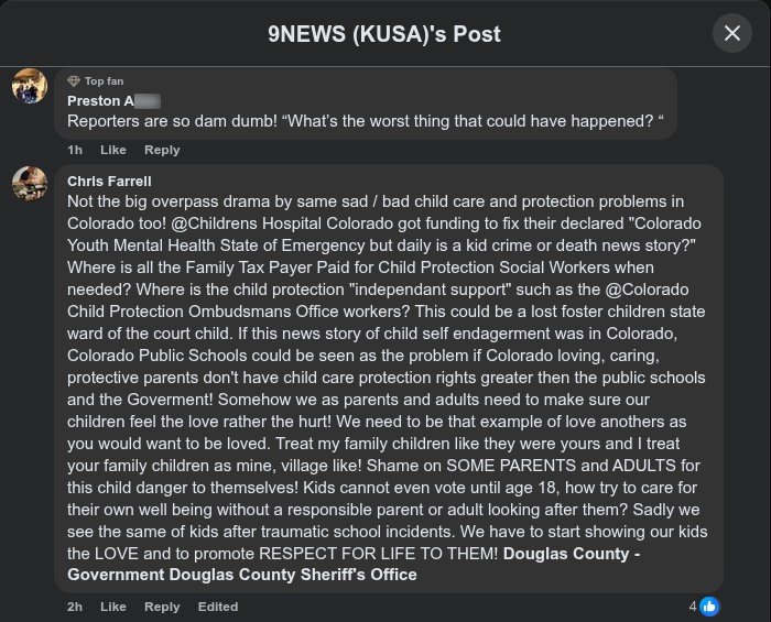 Not the big overpass drama by same sad / bad child care and protection problems in Colorado too! @Childrens Hospital Colorado got funding to fix their declared "Colorado Youth Mental Health State of Emergency but daily is a kid crime or death news story?" Where is all the Family Tax Payer Paid for Child Protection Social Workers when needed? Where is the child protection "independant support" such as the @Colorado Child Protection Ombudsmans Office workers? This could be a lost foster children state ward of the court child. If this news story of child self endagerment was in Colorado, Colorado Public Schools could be seen as the problem if Colorado loving, caring, protective parents don't have child care protection rights greater then the public schools and the Goverment! Somehow we as parents and adults need to make sure our children feel the love rather the hurt! We need to be that example of love anothers as you would want to be loved. Treat my family children like they were yours and I treat your family children as mine, village like! Shame on SOME PARENTS and ADULTS for this child danger to themselves! Kids cannot even vote until age 18, how try to care for their own well being without a responsible parent or adult looking after them? Sadly we see the same of kids after traumatic school incidents. We have to start showing our kids the LOVE and to promote RESPECT FOR LIFE TO THEM! Douglas County - Government Douglas County Sheriff's Office