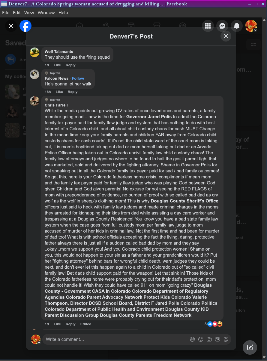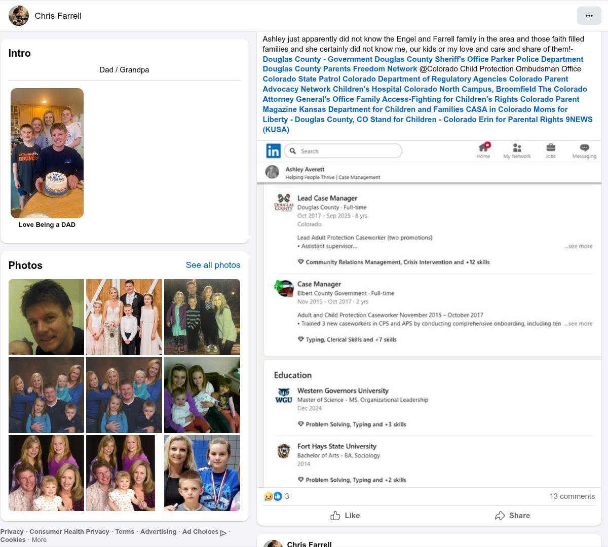 Ashley just apparently did not know the Engel and Farrell family in the area and those faith filled families and she certainly did not know me, our kids or my love and care and share of them!- Douglas County - Government Douglas County Sheriff's Office Parker Police Department Douglas County Parents Freedom Network @Colorado Child Protection Ombudsman Office Colorado State Patrol Colorado Department of Regulatory Agencies Colorado Parent Advocacy Network Children's Hospital Colorado North Campus, Broomfield The Colorado Attorney General's Office Family Access-Fighting for Children's Rights Colorado Parent Magazine Kansas Department for Children and Families CASA in Colorado Moms for Liberty - Douglas County, CO Stand for Children - Colorado Erin for Parental Rights 9NEWS (KUSA)