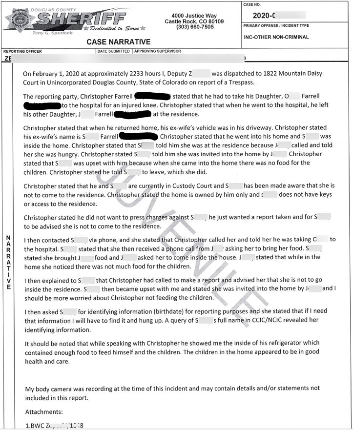 Below is copy of a sheriff report. I didn't think much of this either but then noticed that he had left the children's names visible which is negligent. It's supposed to vindicate him in that his ex-wife is hysterical (type) but his one daughter was alone so unsupervised. The phone conversation the deputy had with the mother is indicative of a flustered person (Chris might've been a gaslighter) and the deputy might've thought that too so let it go. The point too is that taking a child to a hospital for a skinned knee would be indicative of serious enough wound to warrant that and that is strange. Trips to emergency rooms (or a medical clinic) can take indefinite amount of time so the mother being worried about the incident would be natural.