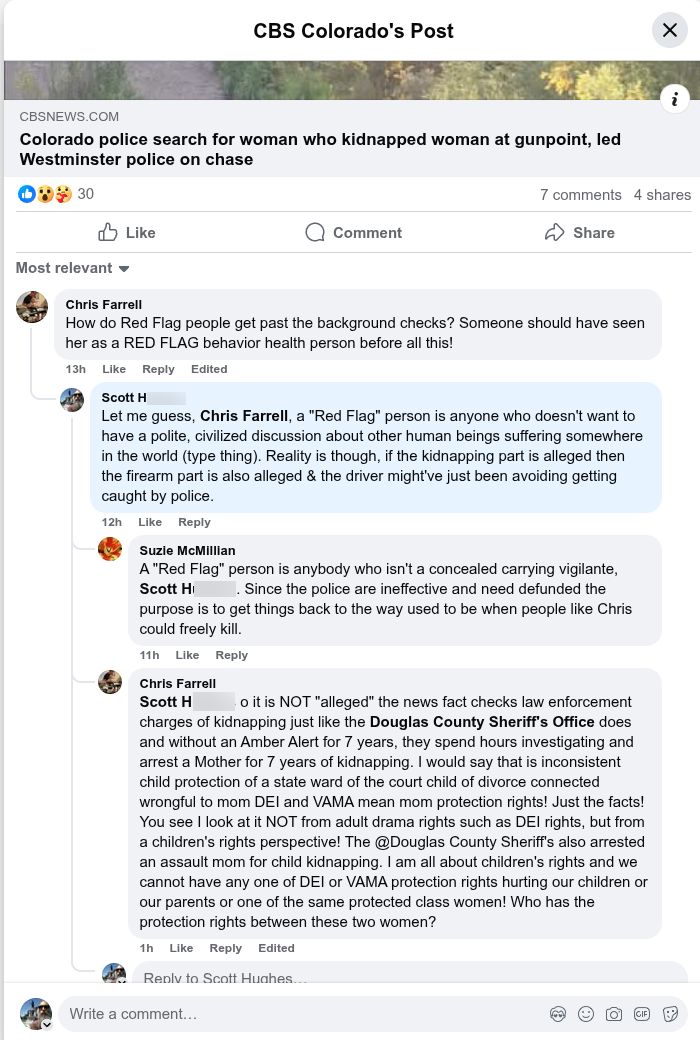In any event, I just so happened to notice a comment on a local news story about a couple women who had an altercation where one was allegedly kidnapped at gunpoint by another. The victim got away, or freed, and the woman perpetrator was chased in a car by police. The car was found but the woman wasn't captured. What caught my attention was the man's comment that included the words "Red Flag behavior" in regards to the woman perpetrator and I assumed that was a new descriptive term that white neo-conservative vigilante types were going to start using so I replied to him that the word "alleged" was used in the headline (basically). I first related the retort of his to the case in Weld County, Colorado where the sheriff misrepresented a state law in a posting he made on social media which attracted an onslaught of threatening, racist, vigilante replies.