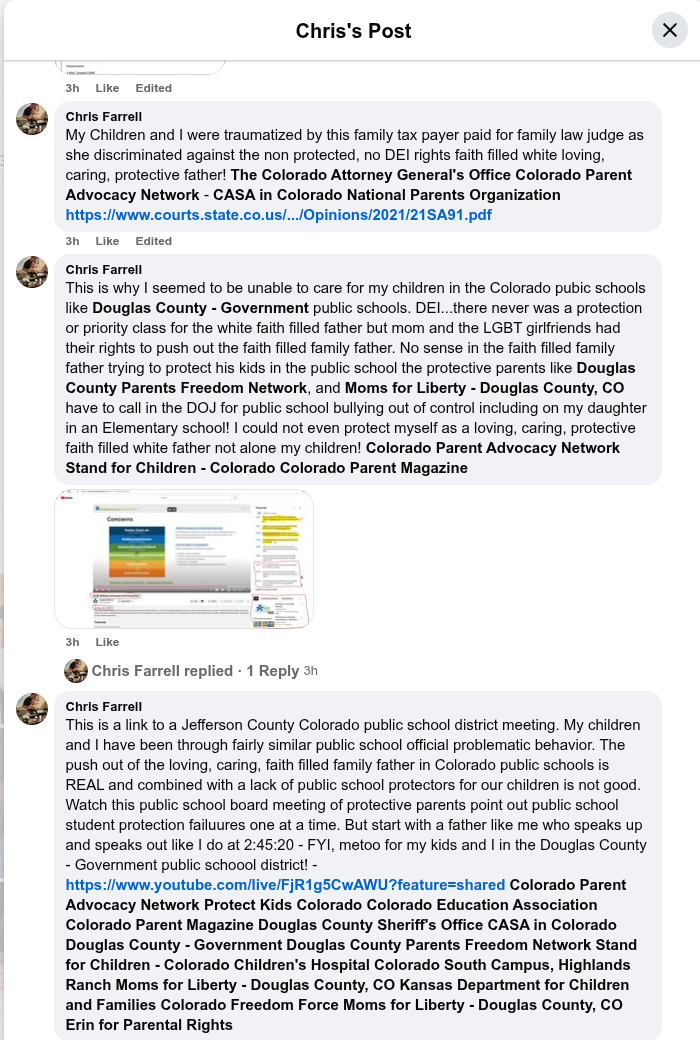 This is a link to a Jefferson County Colorado public school district meeting. My children and I have been through fairly similar public school official problematic behavior. The push out of the loving, caring, faith filled family father in Colorado public schools is REAL and combined with a lack of public school protectors for our children is not good. Watch this public school board meeting of protective parents point out public school student protection failuures one at a time. But start with a father like me who speaks up and speaks out like I do at 2:45:20 - FYI, metoo for my kids and I in the Douglas County - Government public schoool district! - https://www.youtube.com/live/FjR1g5CwAWU?feature=shared Colorado Parent Advocacy Network Protect Kids Colorado Colorado Education Association Colorado Parent Magazine Douglas County Sheriff's Office CASA in Colorado Douglas County - Government Douglas County Parents Freedom Network Stand for Children - Colorado Children's Hospital Colorado South Campus, Highlands Ranch Moms for Liberty - Douglas County, CO Kansas Department for Children and Families Colorado Freedom Force Moms for Liberty - Douglas County, CO Erin for Parental Rights