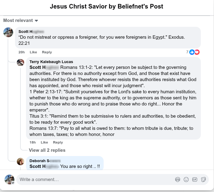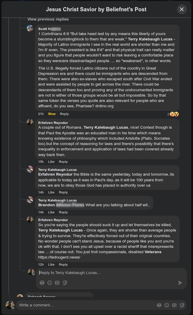 So I took some screencaptures and copied the plain text of a number of his more recent posts and comments on his own profile. My point is that it's up to people of Christian faith to maintain a degree of integrity, or at least make it clear that we disagree with radical anti-gov't idealogy. There could be plenty to debate and dissent from in regards to various policies but the fact that average people work for our gov't and it's gov't "by the people...", who are human beings and humans are not perfect so we need to work with what we have, or "within the system", as I think of it since the alternative is either anarchy or Totalitarianism.